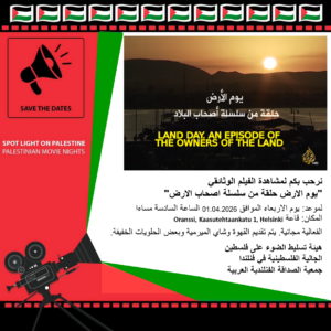 Tervetuloa katsomaan “Land Day – An Episode of the Owners of the Land” dokumenttia. Dokumenttifilmi kertoo vuoden 1948 Nakban yhteydessä Israeliin jääneiden palestiinalaisten kohtalosta ja heidän pitkästä taistelustaan olemassaolonsa ja maaoikeuksiensa puolesta. Vuonna 1976 Israelin viranomaiset yrittivät takavarikoida vielä lisää maata Galilean alueella. Tähän palestiinalaiset vastasivat laajoilla protesteilla ja lakoilla. Mielenosoitukset tukahdutettiin väkivalloin: kuusi palestiinalaista sai surmansa ja yli sata ihmistä haavoittui.