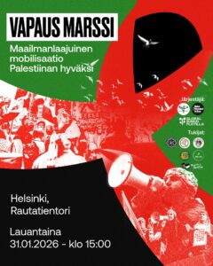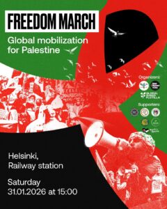 Lauantaina 31.1.2026 klo 15 Rautatientorilta mielenosoitus Vapauttakaa palestiinalaiset vangit – Free Palestinian Hostages  .