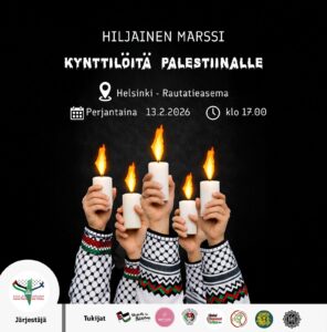 Tule mukaan osoittamaan mieltä Palestiinan puolesta. Hiljainen mielenosoitusmarssi Kynttilä Palestiinalle alkaa klo 17 Rautatientorilta ja päättyy Narinkkatorille.